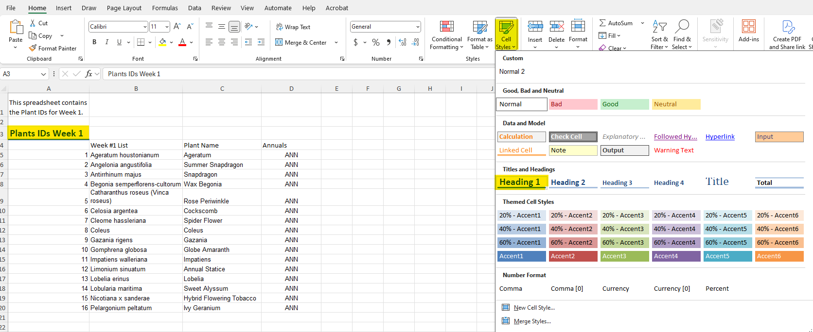 - Under the Home tab, add a heading by selecting a cell style, select Heading 1.