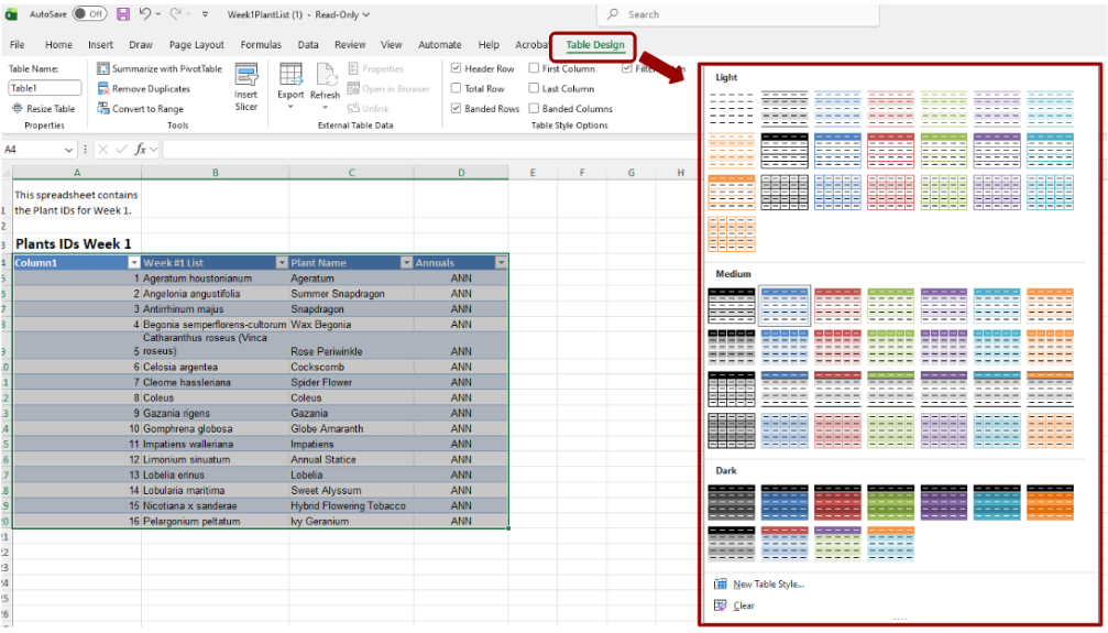 Note: You can choose a table style and specify headings from the Table Design tab after creating the table.